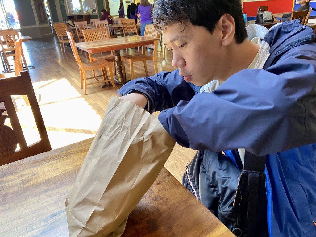 マラサダが入っていた袋をちぎって、それでマラサダを包んで食べました。