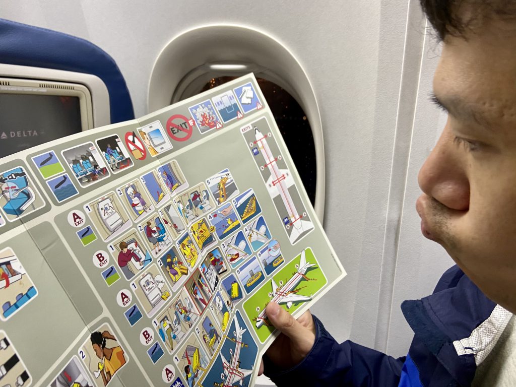 飛行機に乗るとモリは絶対避難の案内をチェックします。