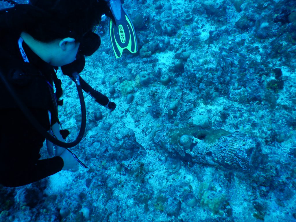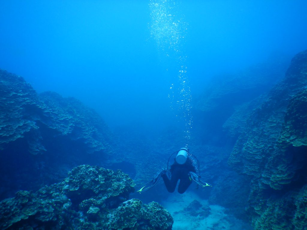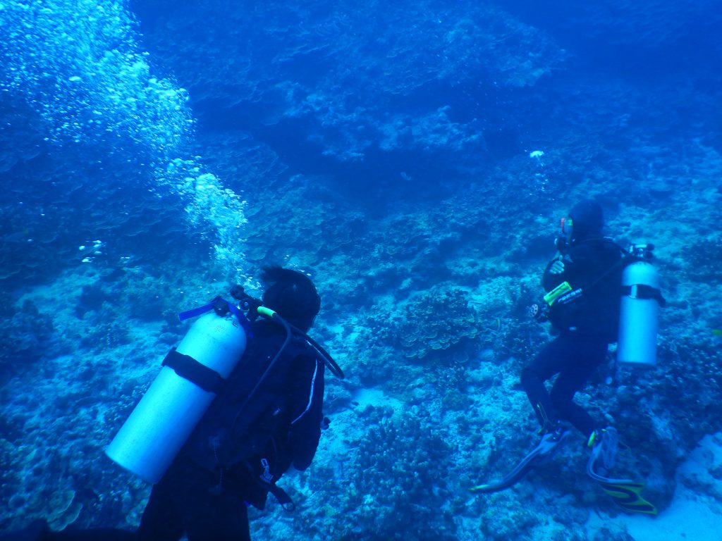 バックロールで海に入り、潜行ロープを伝って水底まで行きました。