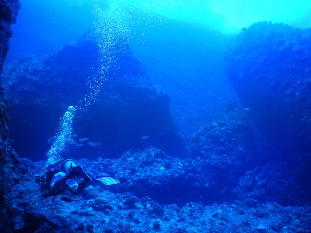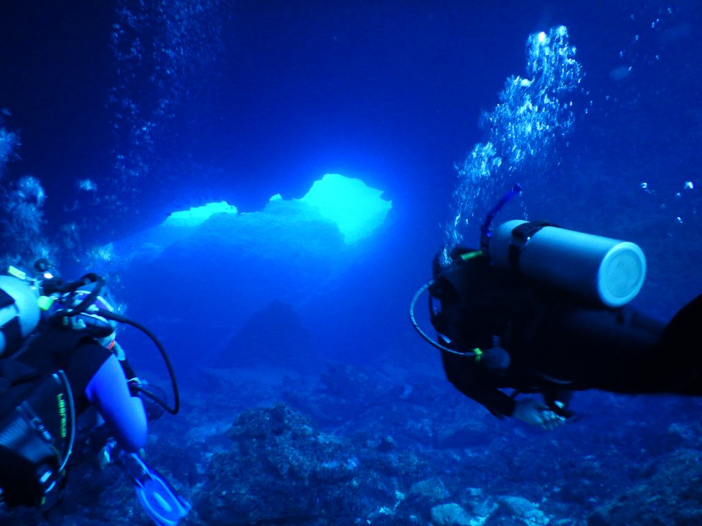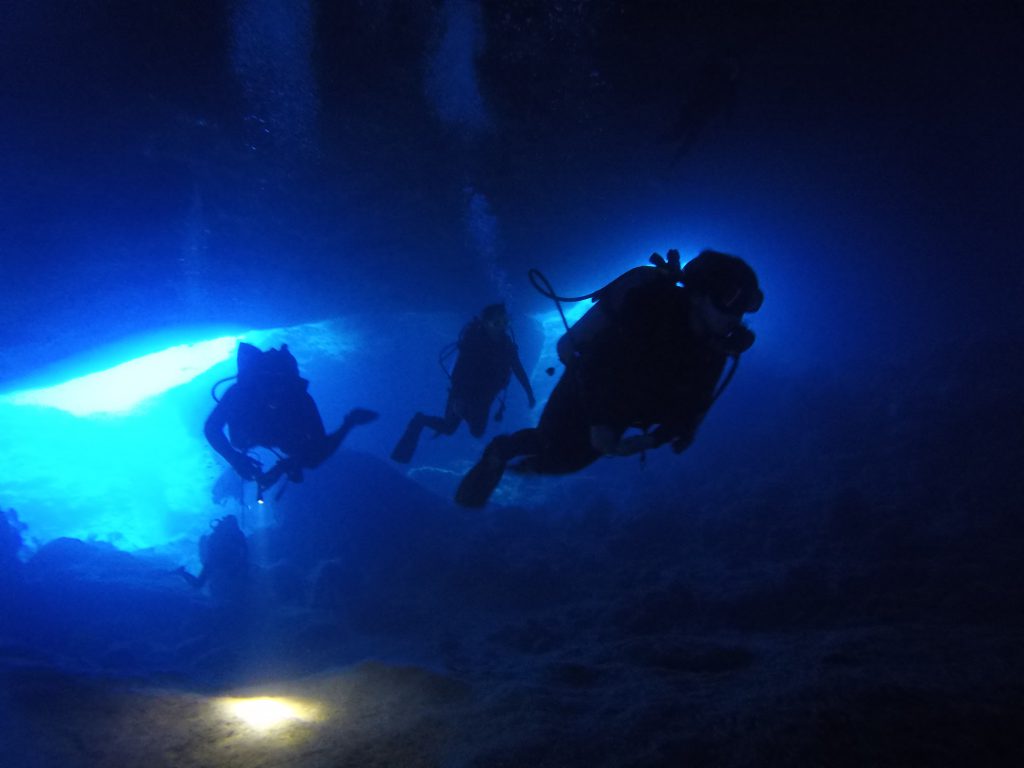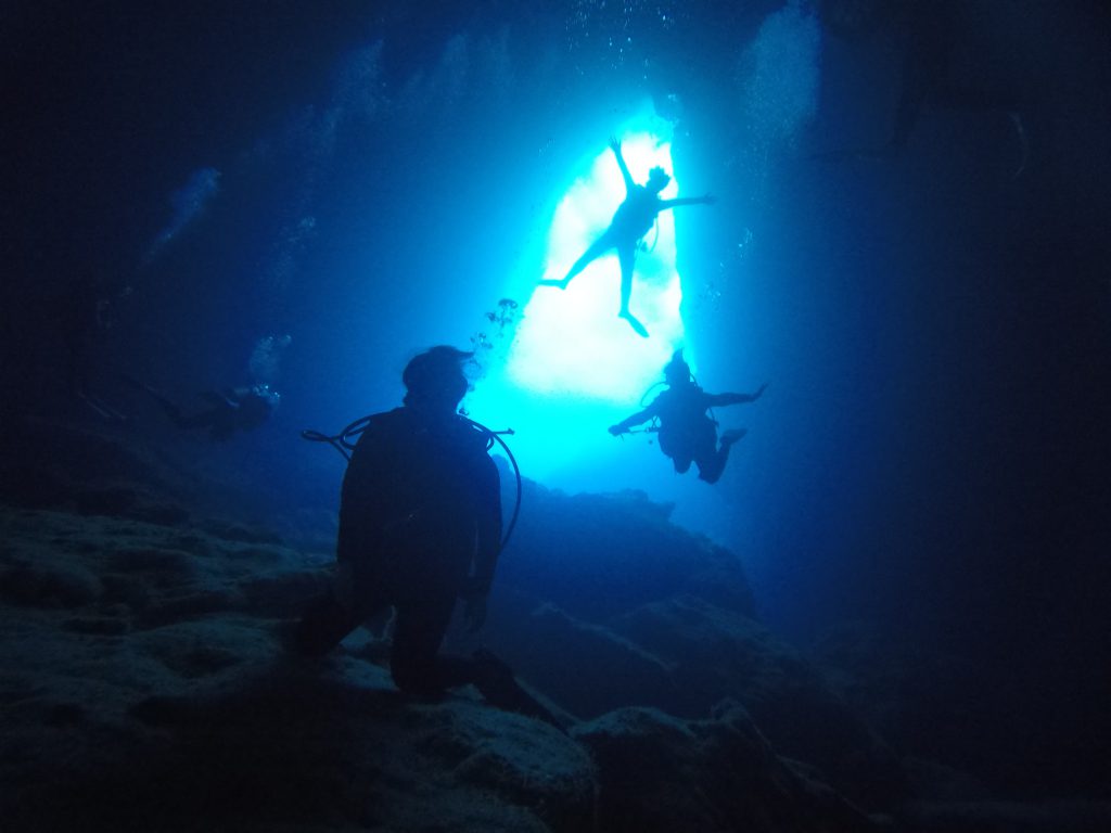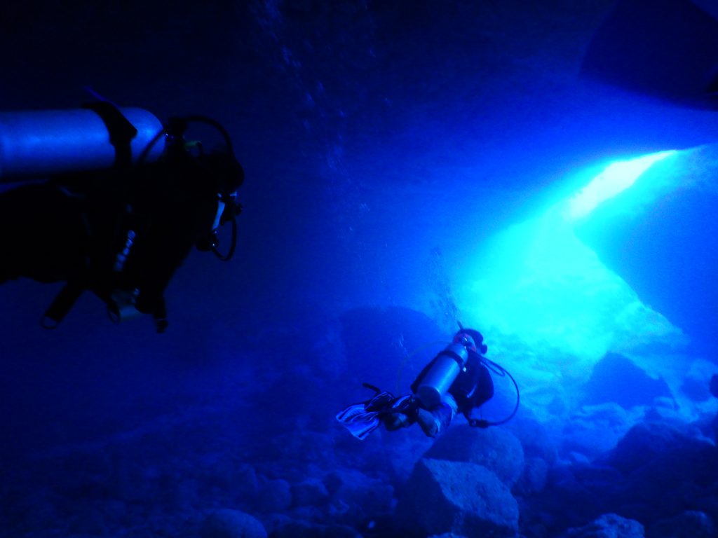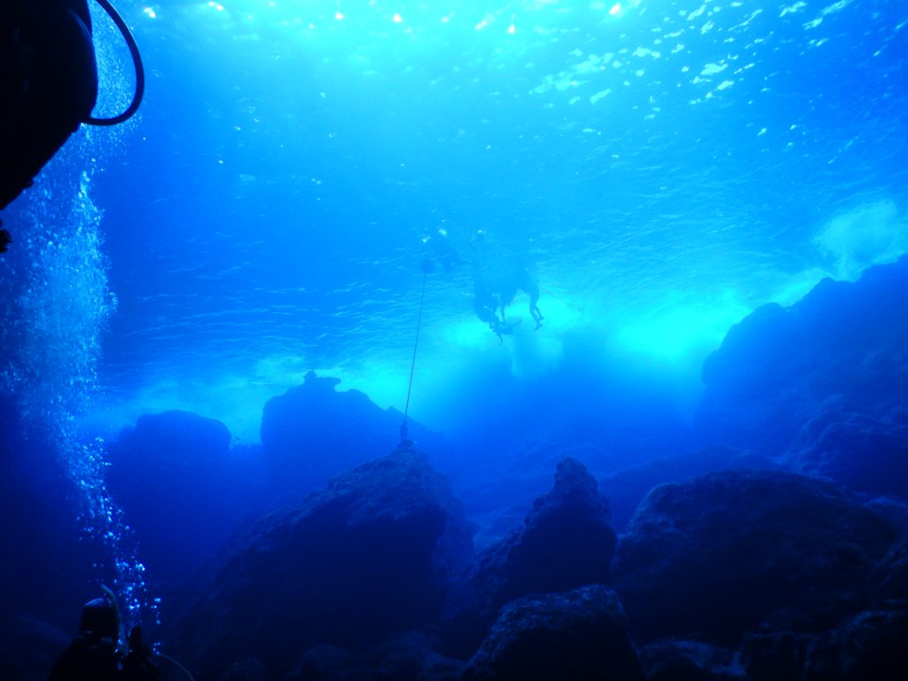 水深20mくらいに海への穴は二つあり、左穴から海へ出て、右穴から戻ってくるというのが今回のダイビングルートです。