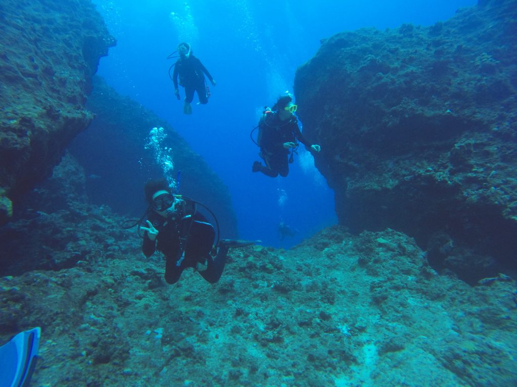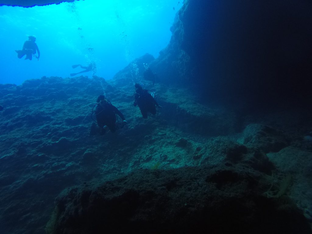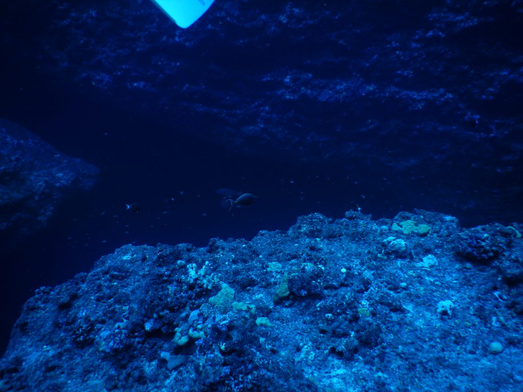 シュノーケリングの時は全く分からなかったのですが、岩の下には広い空間が広がっていました!!
