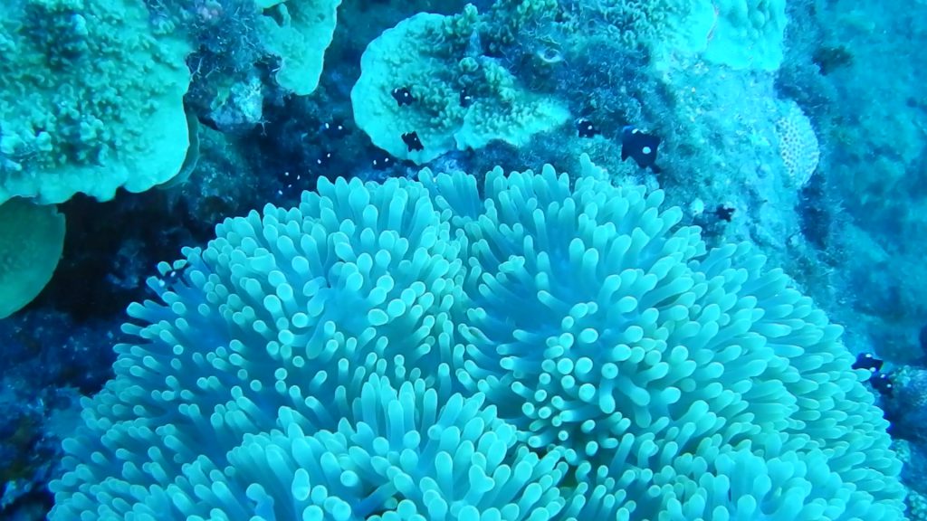 このイソギンチャクの上の方に黒い魚がいるの分かりますか?