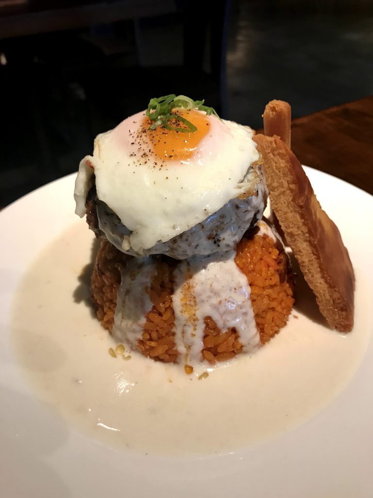 赤いご飯の上にハンバーグと目玉焼き、横にケラグエンにも付いてた甘いピタパンみたいなものの揚げたバージョンが添えられてました。