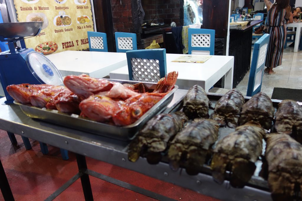 たくさん海鮮料理のお店がありますが、どのお店も赤い魚と海老をアピールしていました。