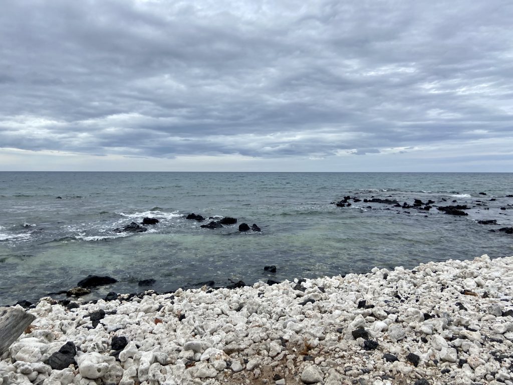 サンゴと溶岩の石がゴロゴロしているので、裸足では歩けないです。