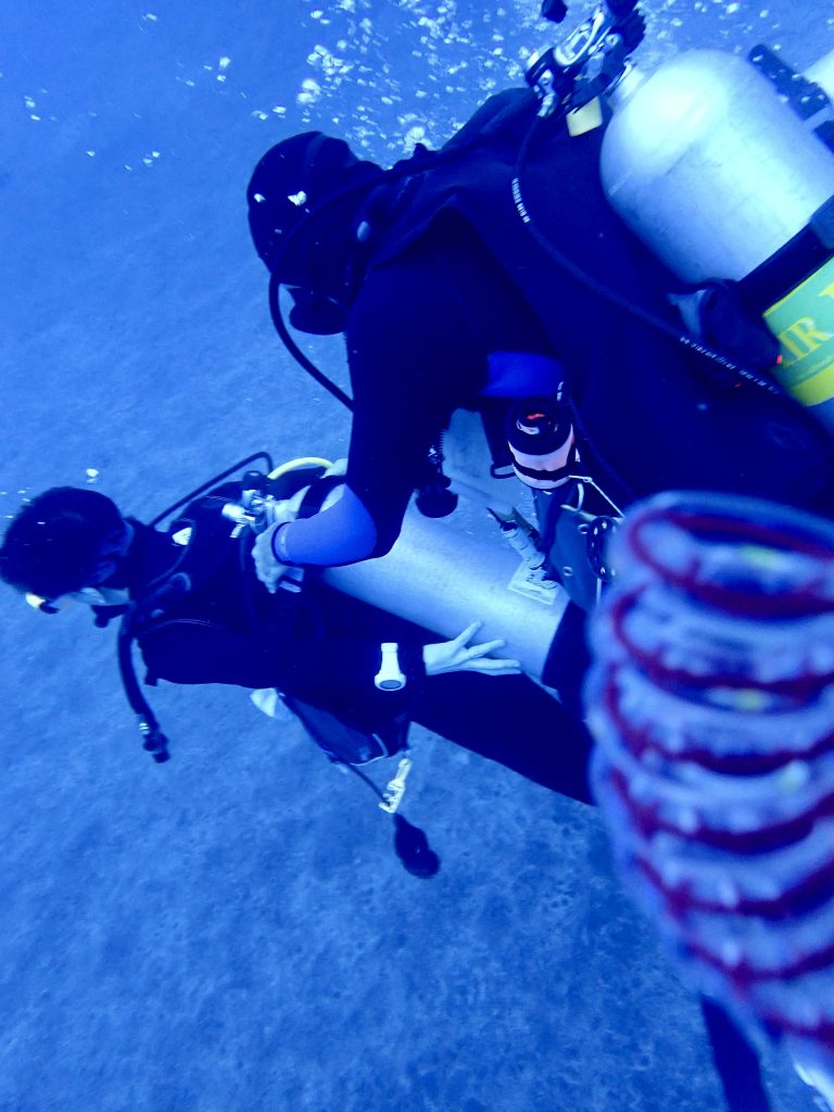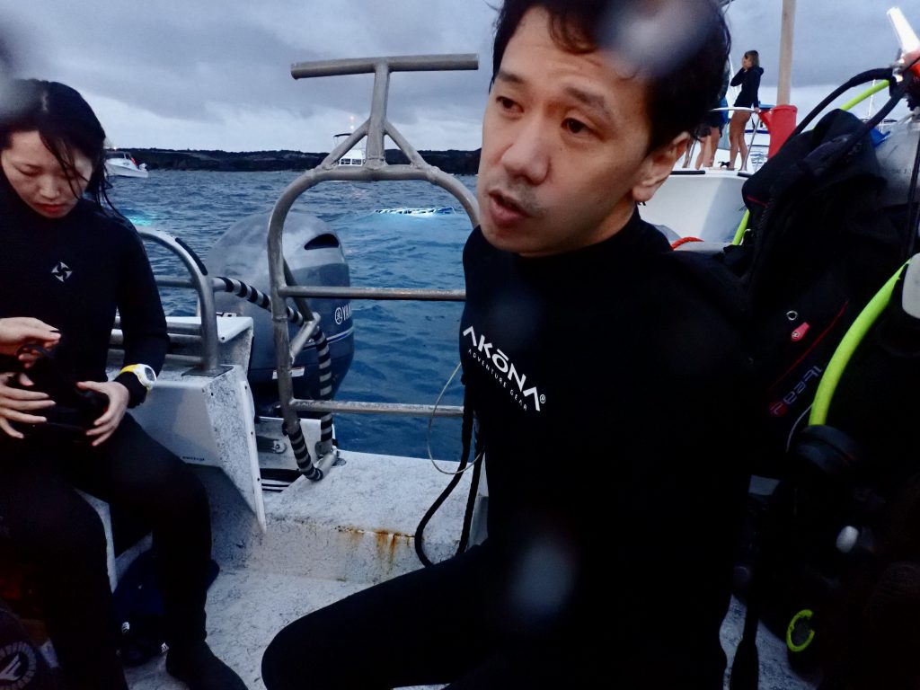 ボートの横からジャイアントエントリー(前から飛び込む方法)で入水です。