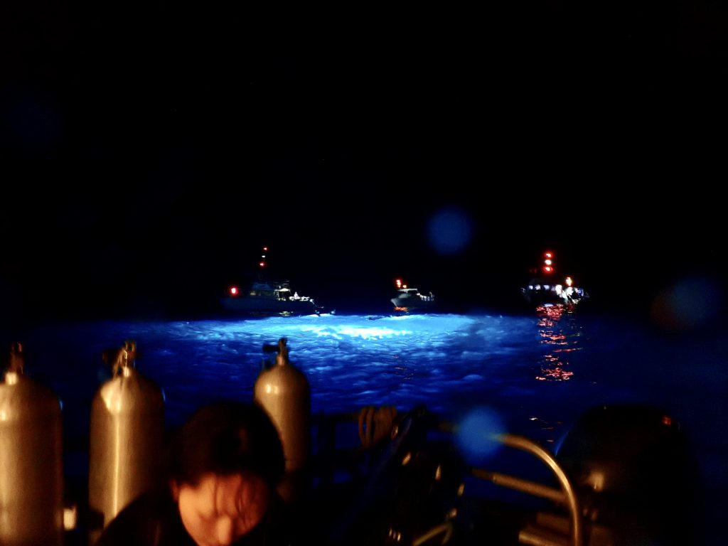 帰りは真っ暗な海をライトで照らしながら船に帰りました。