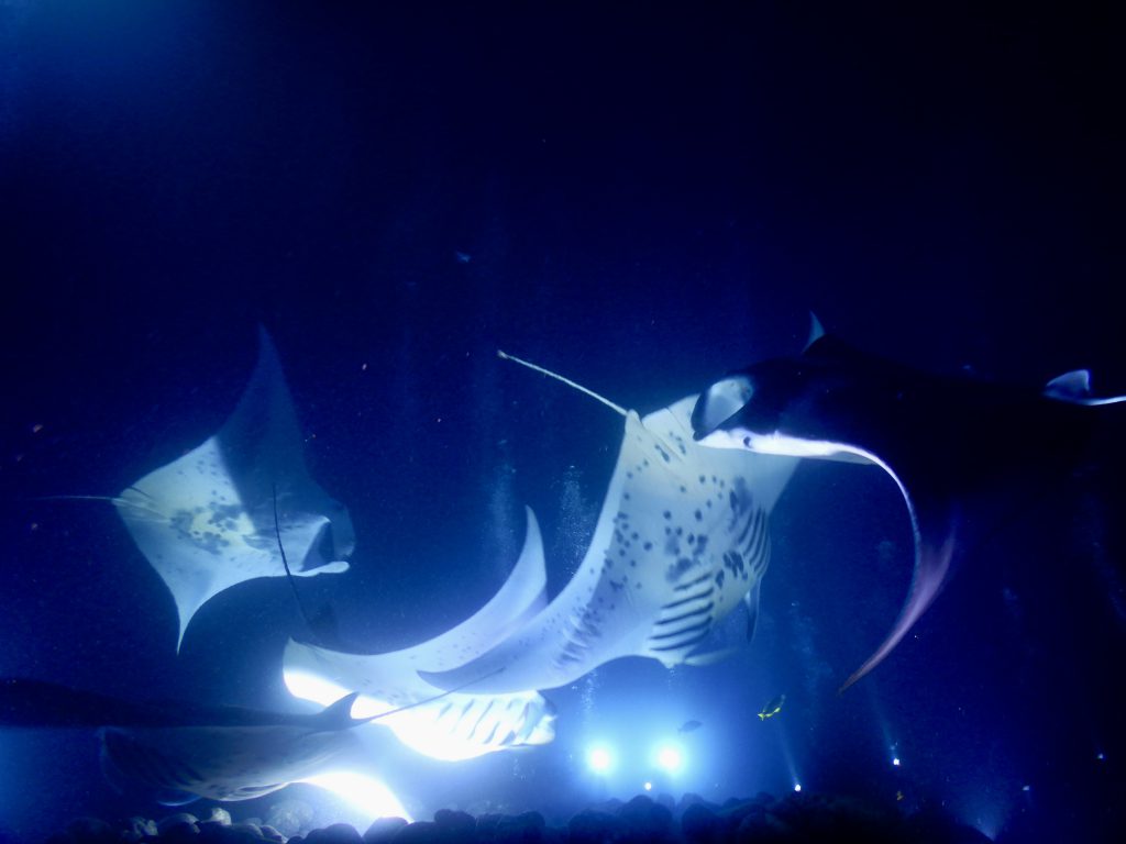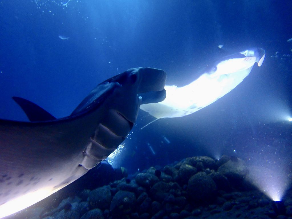 水中にライトをたくさん置いておくと、光に集まるプランクトンを食べにマンタがやってくるんです!