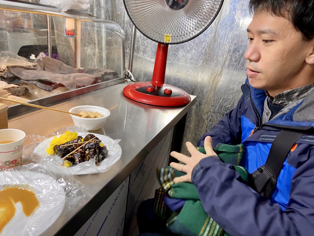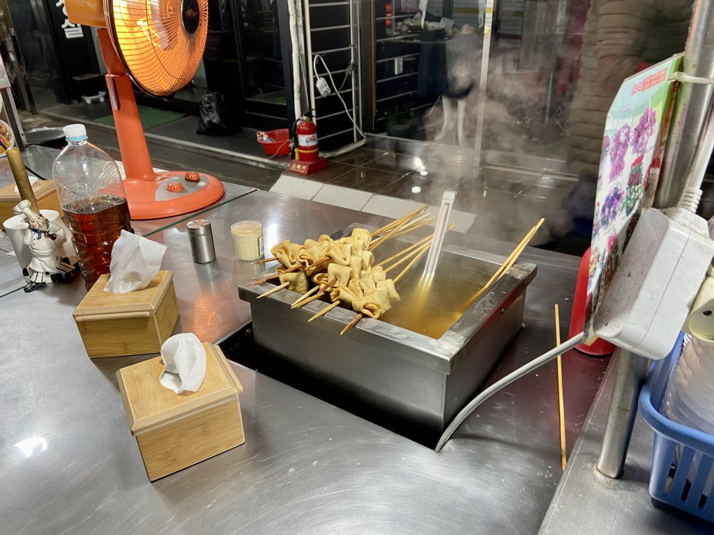 モリの好きな韓国おでんを地元の人が立ち食いしています。
