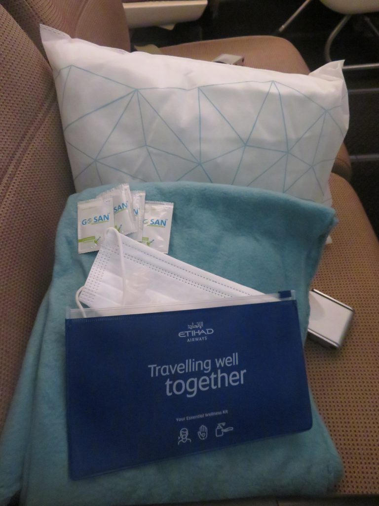 枕と大きなブランケット、それからポーチの中にマスクとサニタイザーとビニール手袋まで入っていました。