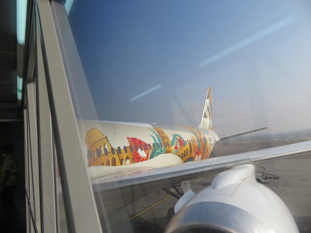 アブダビとローマの2回の乗り継ぎがあるルートです。