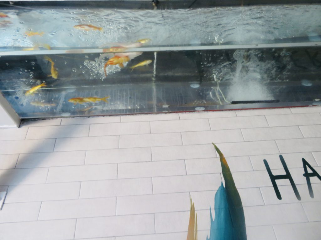 シーフードレストランに金魚とは変な気もしますし、天井に水槽って、びっくりです!