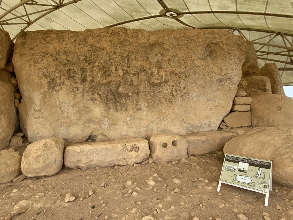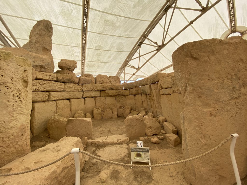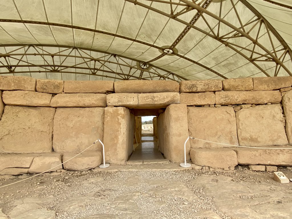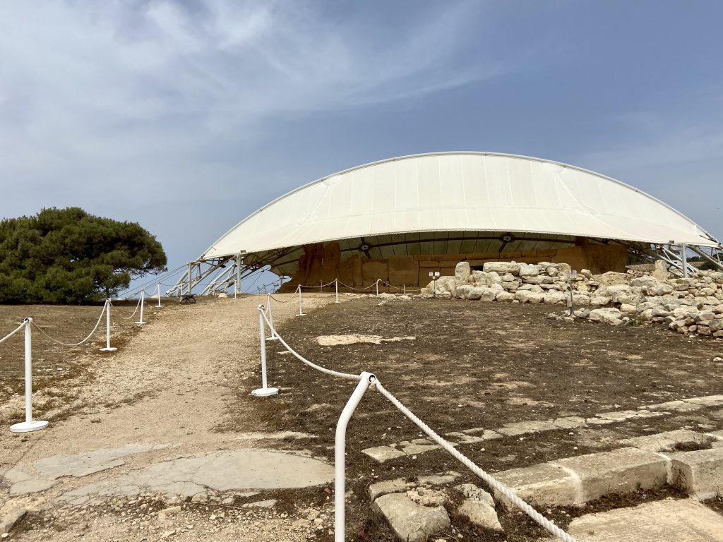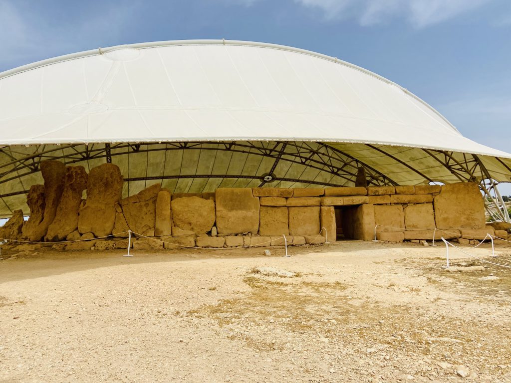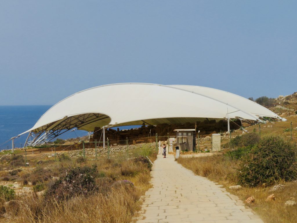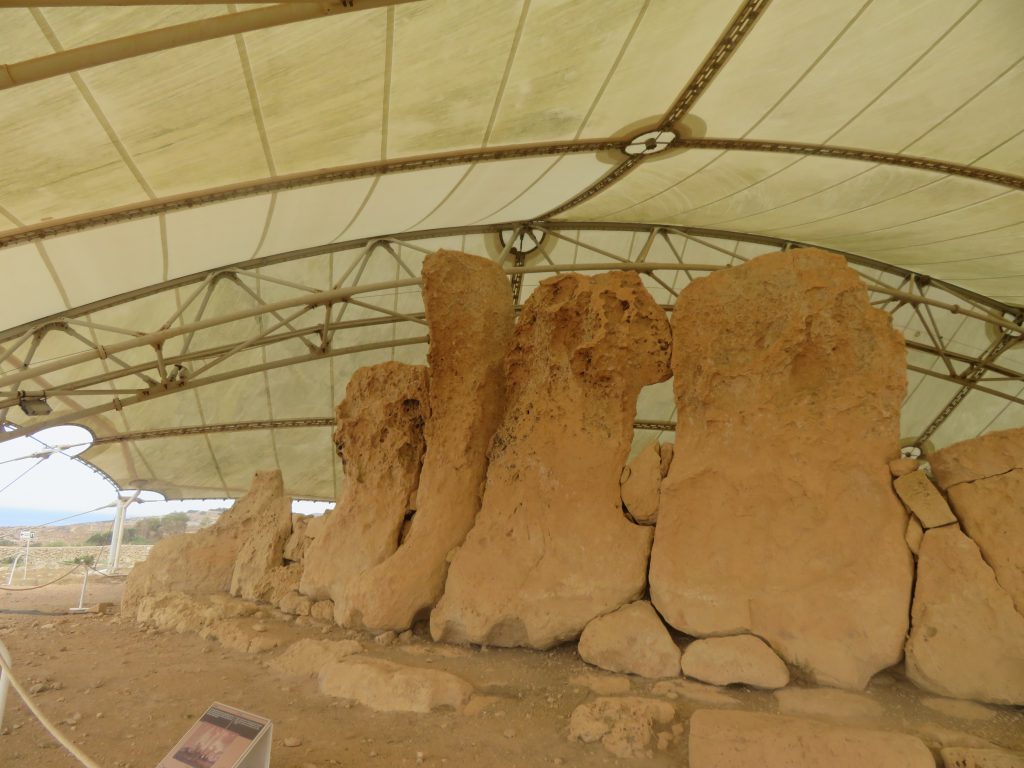 ハジャーイム神殿は柔らかい石灰岩(グロビゲリナ石:Globigerina Limestone)で建造されていて、風化が進んでいるため現在はこのようなテントに覆われています。